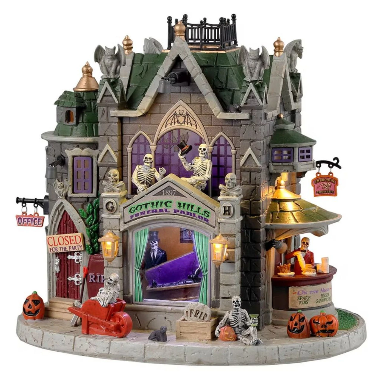 Wonderfully awful the Gothic Hills Funeral Parlor is the place to be for the undead. Skeletons are seen making merry inside and out while a counter outside serves up spare ribs and finger sandwiches which we believe are literal spare ribs and fingers. Yuck. Gargoyles, a party atmosphere, and lots of wonderful details make this funeral parlor a must have for a truly Spooky Town.