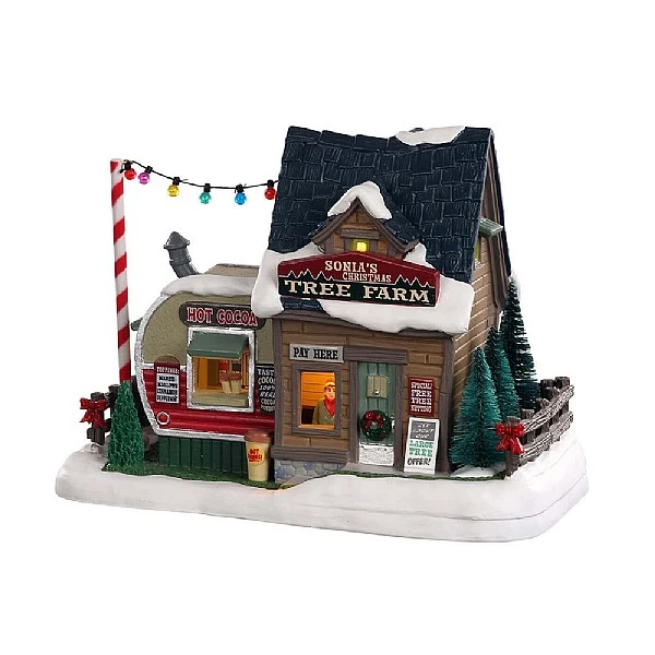 - Outside the cabin is a selection of freshly chopped Christmas trees, which you can pay for with the attendant who’s sitting in the lit-up payment window.